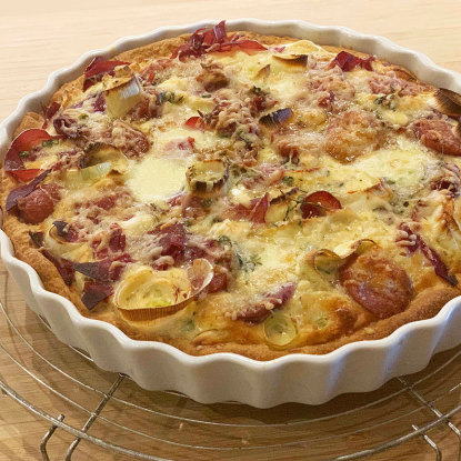 Passend für das Aprilwetter - mal frühlingshaft mild, mal regnerisch kalt - passt diese Quiche mit dem herzhaften Belag aus Gemüse, Wurst und Schinken mit cremigem Guss aus Eiern, Sahne und Käse.