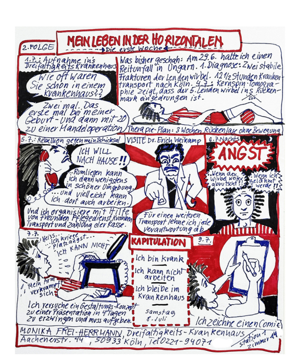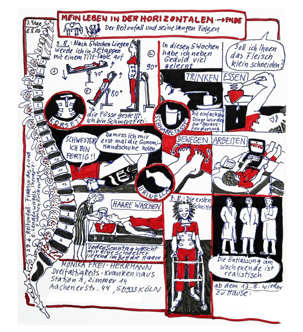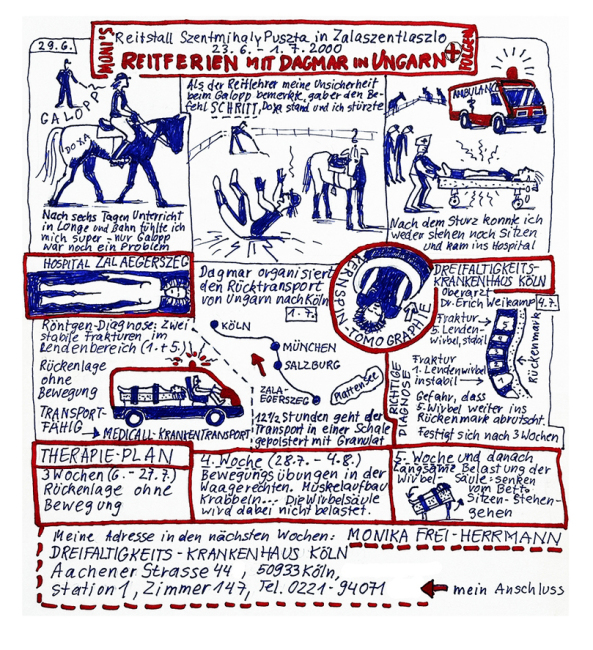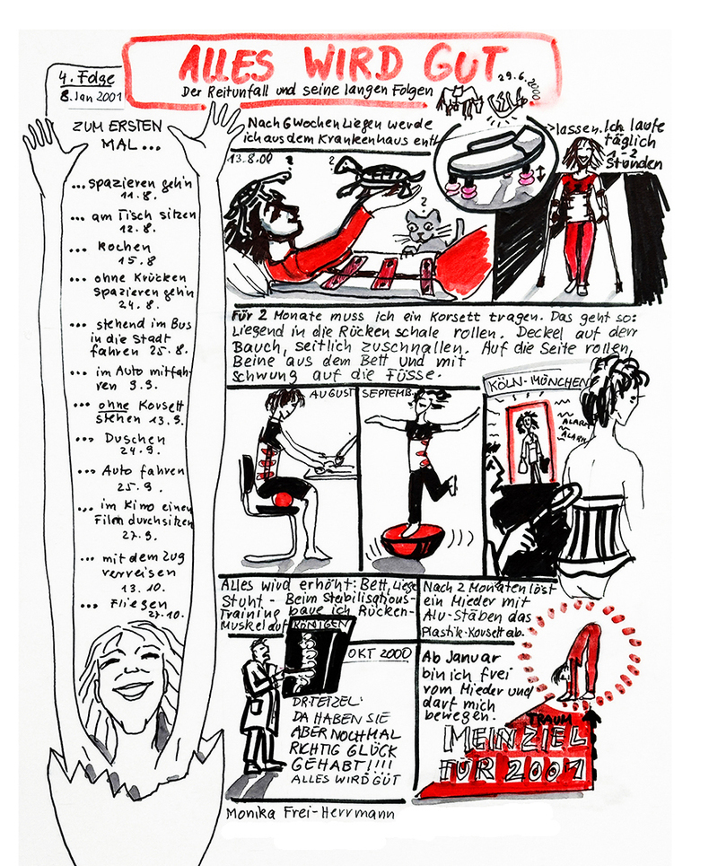 Juni 2000. Nach meinem Reitunfall in Ungarn mit doppelter Wirbelsäulenfraktur lag ich für viele Wochen bewegungslos im Krankenhaus. Um mir die Zeit zu vertreiben habe ich den Unfall und die Folgen als Comik festgehalten. Versendet wurde der vierteilige Comik per FAX an meine Freunde und Familie, denn das war damals im Jahr 2000 das gängige Kommunikationsmittel.