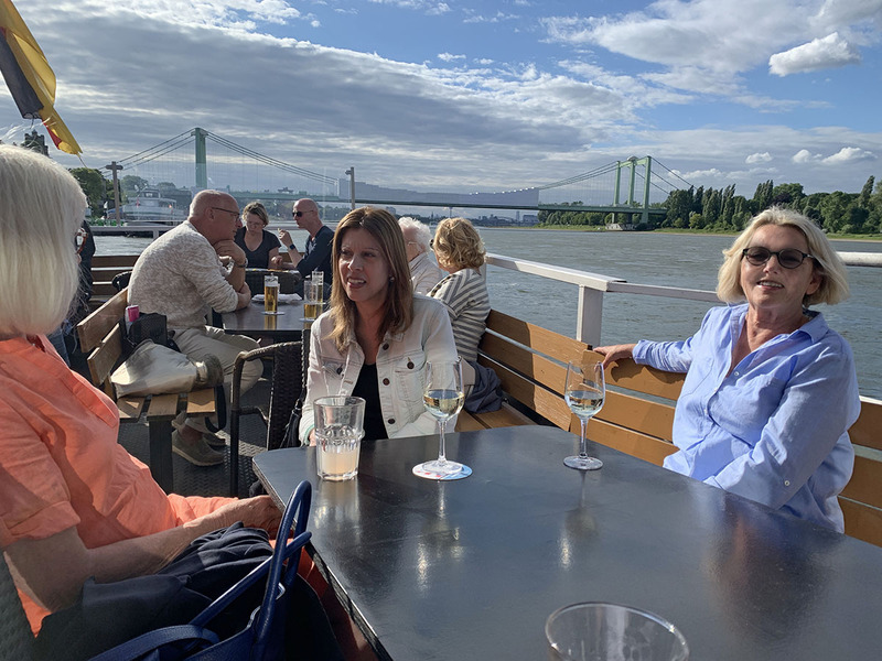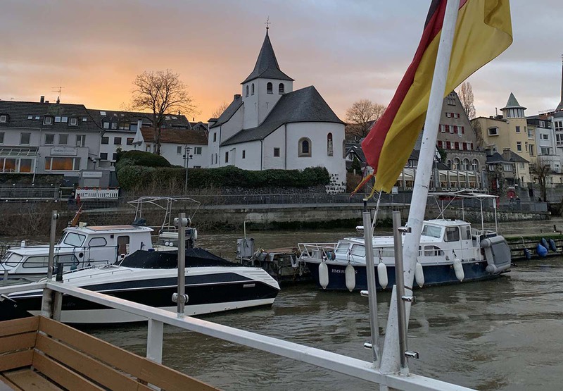 Die MS Bootshaus Rodenkirchen liegt direkt unterhalb der historischen Rodenkirchner Kirche vor Anker.