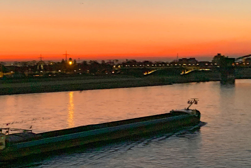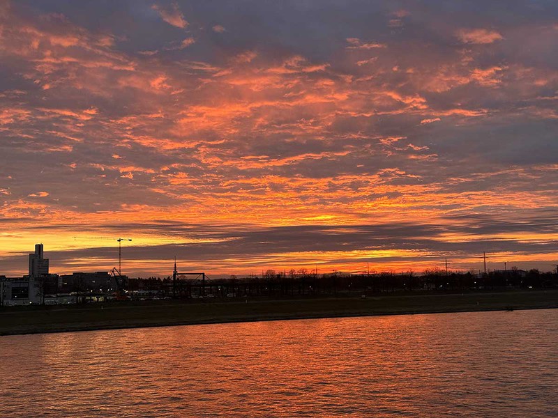 Bei klarem Himmel ist der Sonnenaufgang über dem Rhein ein gewaltiges Schauspiel. Zuerst zeigt sich am Horizont ein schmaler Lichtstreifen, der sich dann beim verbreitern in gelbes, orangenes oder rotes Licht verwandelt. Je höher die Sonne steigt. umso gewaltiger wird das Farbenspiel. Denn die Farbenpracht zeigt sich nicht nur am Himmel, sondern spiegelt sich genauso im Rhein.