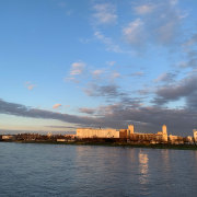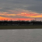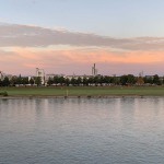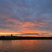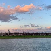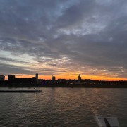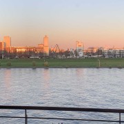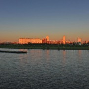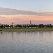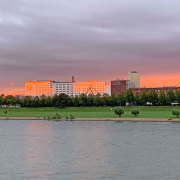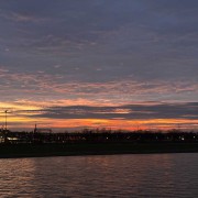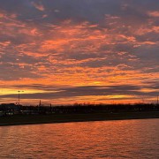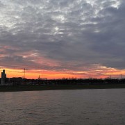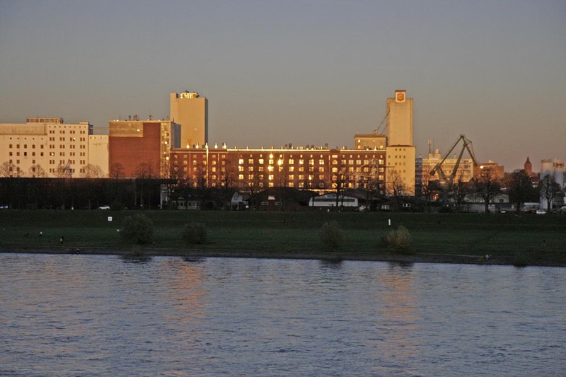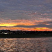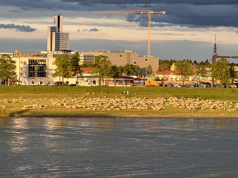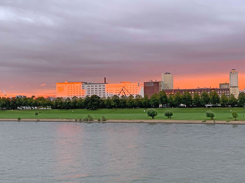 Wenn im Kölner Westen die Sonne untergeht, spiegelt sich ihr goldenes Licht in den Poller Wiesen. Das ist besonders schön, wenn die Schafe dort gerade weiden. Manchmal werden die Gebäude auf der anderen Rheinseite so angestrahlt dass sie Rot, Orange oder Gelb leuchten.